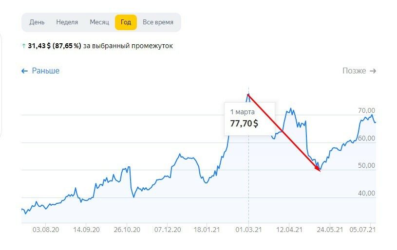 А это — график цен на акции Twitter: если кто-то купил их 1 марта 2021 года, сейчас этот человек в минусе