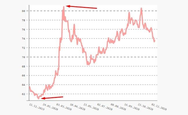20 ₽ за один доллар можно было заработать, если бы вы купили их в конце 2019 года, а продали на пике цены, в марте-апреле 2020 года